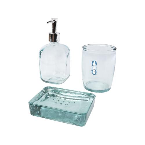 Набор для ванной из 3 предметов из 100% переработанного стекла, в который входят: дозатор для мыла (450 мл), стакан (430 мл) и мыльница (13 x 10 см). На изготовление переработанного стекла затрачивается меньше энергии, сырья и добавок, чем на изготовление традиционного стекла. Можно мыть в посудомоечной машине.