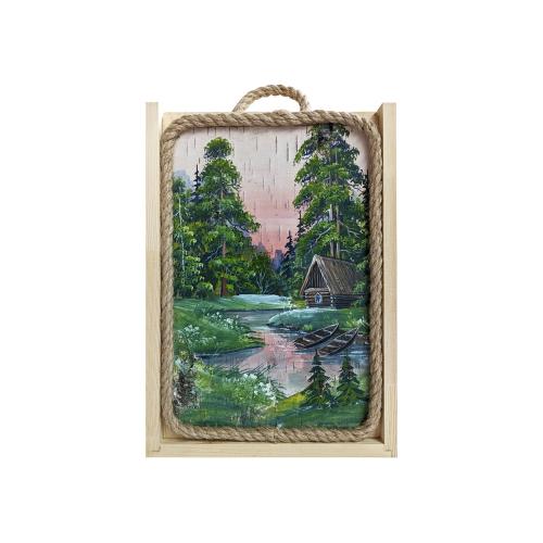 Подарочный набор в уникальном деревянном коробке с рисунком на бересте: книга, в которую входят лучшие тосты XX века, три стопки в виде патронов, уникальный таежный нож с множеством функций. Место для бутылки водки 0.5л.