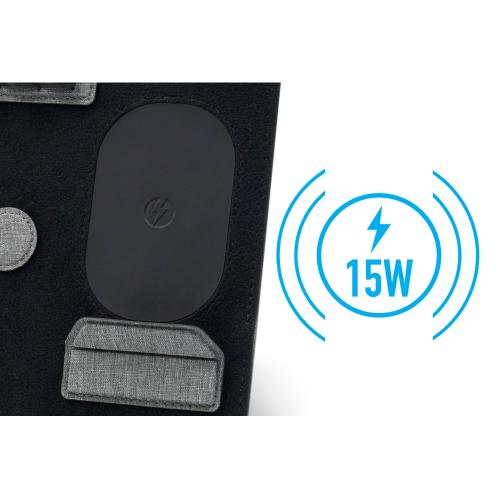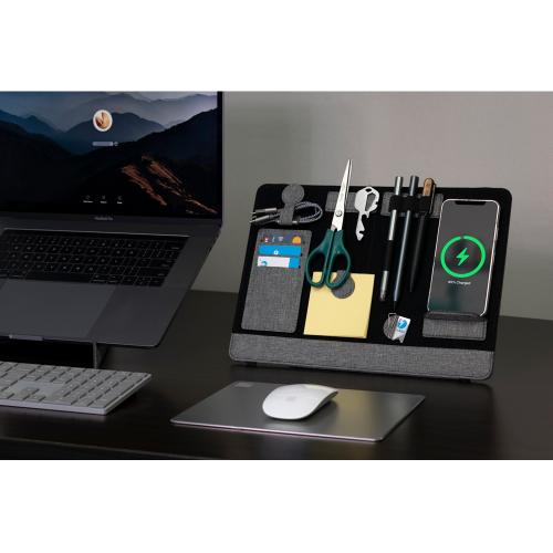 Помимо подставки для ноутбука, этот настольный органайзер оснащен подставкой для телефона с быстрой беспроводной зарядкой мощностью 15 Вт (регулируемой), планшетом для обмена, двумя магнитными док-станциями, держателем для ручек, держателем для карт, зажимом для кабеля и подставкой для телефона. Поддерживать порядок на рабочем столе еще никогда не было так просто!