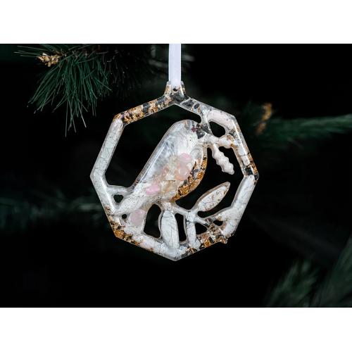 Набор из 3-х елочных игрушек: в форме оленя, снегиря и елки. Игрушки выполнены из ювелирной эпоксидной смолы и украшены галтовкой из натуральных минералов.