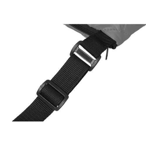 Двухсторонний плед с водоотталкивающим покрытием с одной стороны и мягким флисом с другой. Складывается в сумку на плечо и фиксируется с помощью молнии. В собранном виде имеет регулируемый по длине ремень для переноски и наружный карман для мелочей.