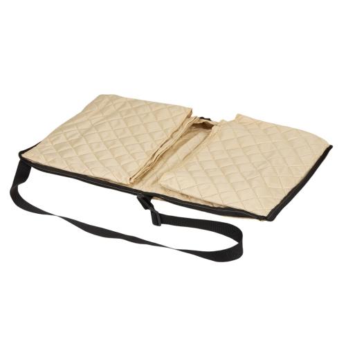 Двухсторонний плед с водоотталкивающим покрытием с одной стороны и мягким флисом с другой. Складывается в сумку на плечо и фиксируется с помощью молнии. В собранном виде имеет регулируемый по длине ремень для переноски и наружный карман для мелочей.
