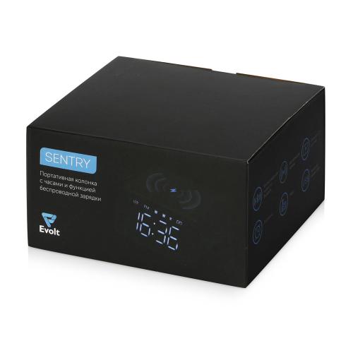 Беспроводная колонка с часами и функцией беспроводной зарядки Sentry от Evolt. Устройство может работать автономно, что позволяет использовать его в любой точке квартиры и за ее пределами и избавиться от проводов на рабочем столе. Колонка подключается к смартфону при помощи Bluetooth, имеет большой динамик, занимающий собой всю нижнюю панель Sentry.