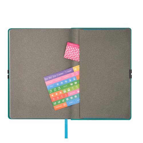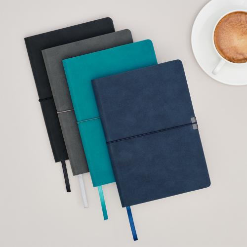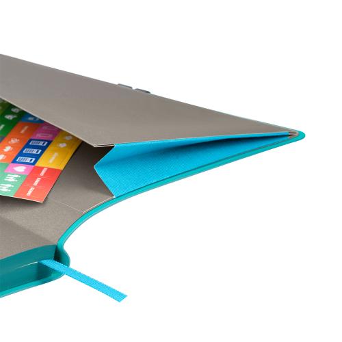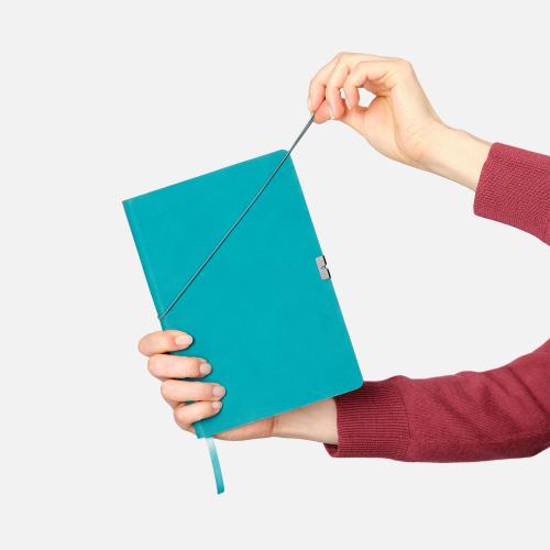 Горизонтальная резинка, фиксирующая обложку, дополнена металлическими элементами, которые не только защищают обложку от повреждений, но и служат стильным акцентом. Матовый срез в тон обложки и светло-кремовые страницы из гладкого, слегка шелковистого офсета подчеркивают изысканность дизайна. Атласное ляссе гармонично завершает образ этого элегантного ежедневника.