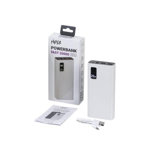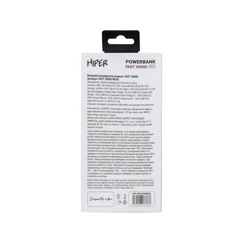 Портативный внешний аккумулятор HIPER FAST 20000 емкостью 20000 мАч (74Втч) оснащён двунаправленным портом USB-C, Micro-USB входом для зарядки, с поддержкой быстрой зарядки аккумулятора QC и PD, 2xUSB-A выходами, максимальный выходной ток 5А, максимальная мощность 22,5 Вт, поддержка быстрой зарядки стандарта QC 18 Вт, поддержка быстрой зарядки стандарта PD 18 Вт, стильный дизайн.