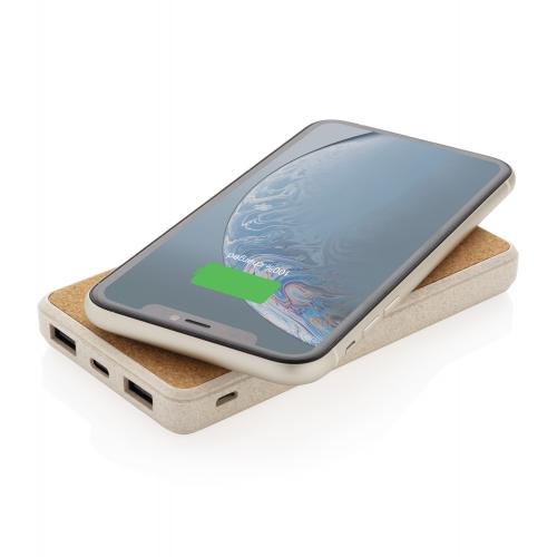 Внешний аккумулятор на 8000 мАч с возможностью беспроводной зарядки 5 Вт. Верхняя часть выполнена из натуральной пробки, а корпус — из пшеничной соломы (35%), смешанной с ABS. Способен подзарядить ваш смартфон до 4 раз. Оснащен долговечным литий-полимерным аккумулятором класса А емкостью 8000 мАч. Специальные индикаторы всегда подскажут вам, когда следует подзарядить устройство. Беспроводная зарядка совместима со всеми устройствами, поддерживающими стандарт QI (смартфоны на Android последнего поколения, iPhone 8 и выше). Вход micro USB: 5В/2А. Вход Type-C: 5В/2А. Выход USB: 5В/2,4А. Беспроводной выход: 5 Вт, 5В/1А. Не содержит ПВХ.