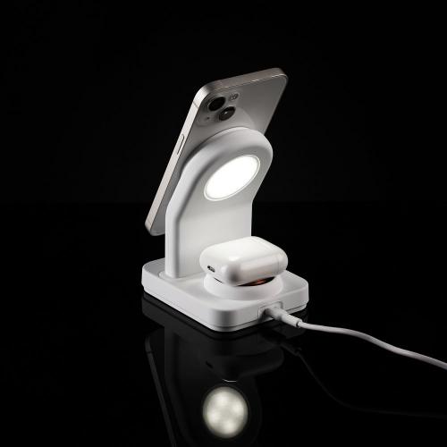 iPhone 12–15 c магнитами MagSafe могут удерживаться на основной области станции. Ранние или компактные модели iPhone или смартфоны с диагональю 5,7–6" на OS Android можно оснастить специальным адаптером Magmate или чехлом со встроенным кольцевым магнитом сзади.