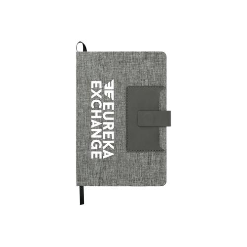 Стильный блокнот с твердой обложкой, обтянутой меланжевой тканью. Отделение для визиток из искусственной кожи и магнитным клапаном, под которым также можно закрепить свою любимую ручку.