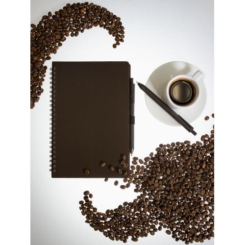 Блокнот на спирали из пластика и кофейного жмыха, дополнен резинкой для ручки.