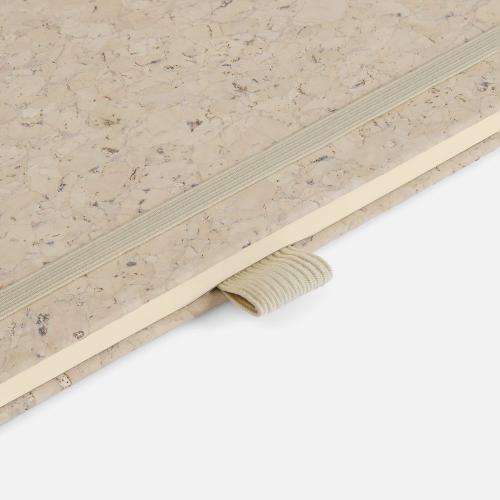 Блокнот с твердой обложкой из натуральной окрашенной пробки, дополнен петлей-резинкой для ручки, ляссе и резинкой в цвет обложки.