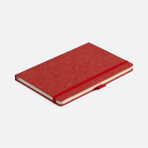 Блокнот с твердой обложкой из натуральной окрашенной пробки, дополнен петлей-резинкой для ручки, ляссе и резинкой в цвет обложки.