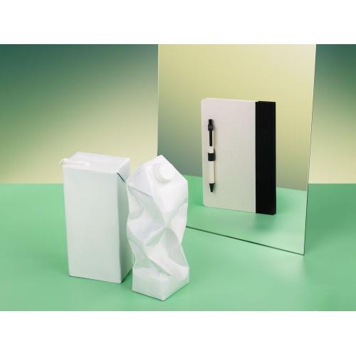 Бумага и обложка произведены из переработанных пакетов из-под молока. Обложка из картона плотностью 140 г/м² .