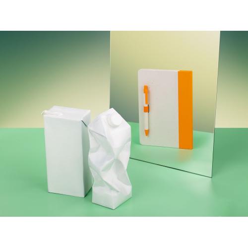 Бумага и обложка произведены из переработанных пакетов из-под молока. Обложка из картона плотностью 140 г/м² .
