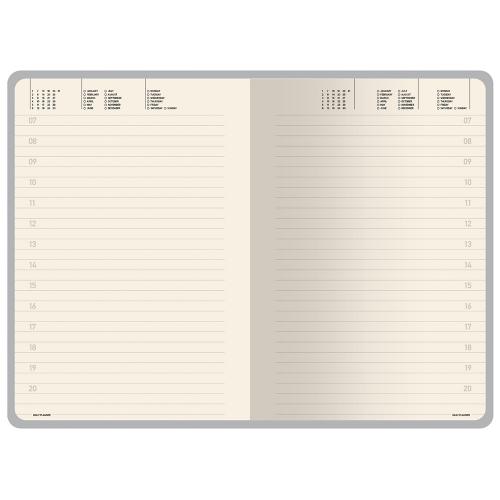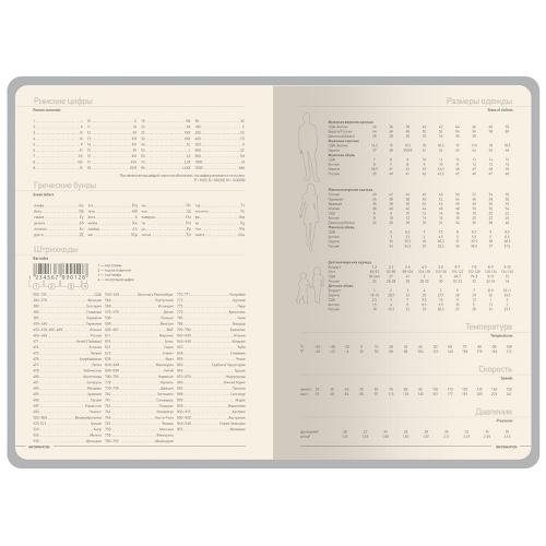 Недатированные страницы в серую линейку имеют отдельное место для проставления числа месяца и дня недели. Справочный блок на 17 страницах содержит полезную информацию из различных областей.