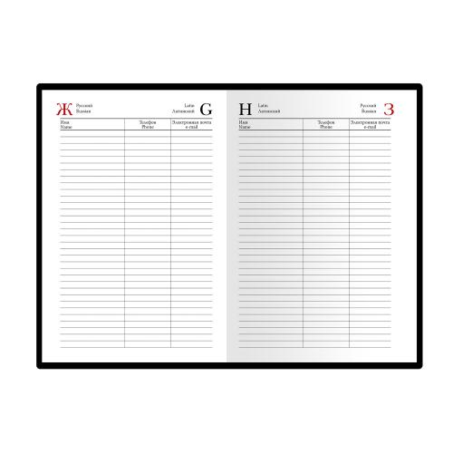 В ежедневнике есть полезная справочная информация и телефонная книга, а также страницы для записи идей, мыслей и составления рабочих планов. Есть перфорация (нижние уголки отрывные). Для изготовления страниц используется качественный бежевый офсет повышенной плотности (80 г/кв м), которая производится японской фирмой Daiwa и подходит для всех видов чернил.