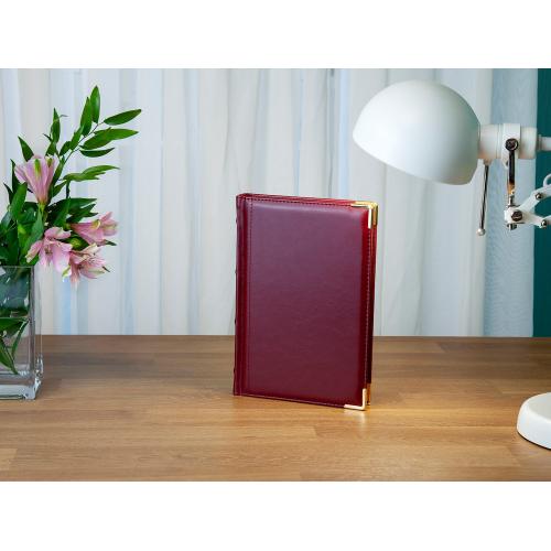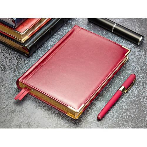 Классический деловой ежедневник линии Boss – образец элегантности. Гладкую тонкую фактуру экокожи подчеркивает декоративная строчка по контуру и металлические закругленные уголки золотистого цвета.