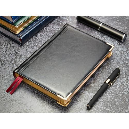 Классический деловой ежедневник линии Boss – образец элегантности. Гладкую тонкую фактуру экокожи подчеркивает декоративная строчка по контуру и металлические закругленные уголки золотистого цвета.