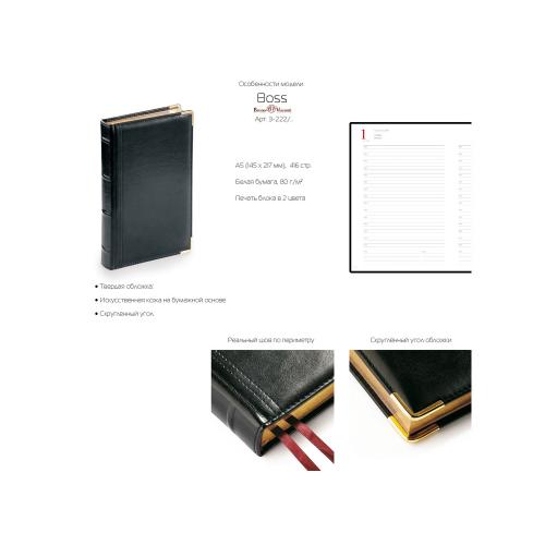 Полудатированный ежедневник Boss от бренда Bruno Visconti - это качественный корпоративный подарок по выгодной цене, произведенный специально под персонализацию. Представлен в универсальном формате А5 и состоит из 416 страниц. Классический деловой ежедневник линии Boss – образец элегантности. Гладкую тонкую фактуру экокожи подчеркивает декоративная строчка по контуру и металлические закругленные уголки золотистого цвета. В ежедневнике есть полезная справочная информация и телефонная книга, а также страницы для записи идей, мыслей и составления рабочих планов. Есть перфорация (нижние уголки отрывные). Для изготовления страниц используется качественный бежевый офсет повышенной плотности (80 г/кв м), которая производится японской фирмой Daiwa и подходит для всех видов чернил. Ежедневник можно персонализировать с помощью тиснения обложки - золотой или серебряной фольгой. Наши ежедневники помогут быть успешным и эффективным в карьере и повседневной жизни!