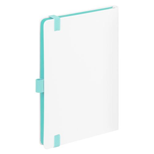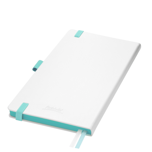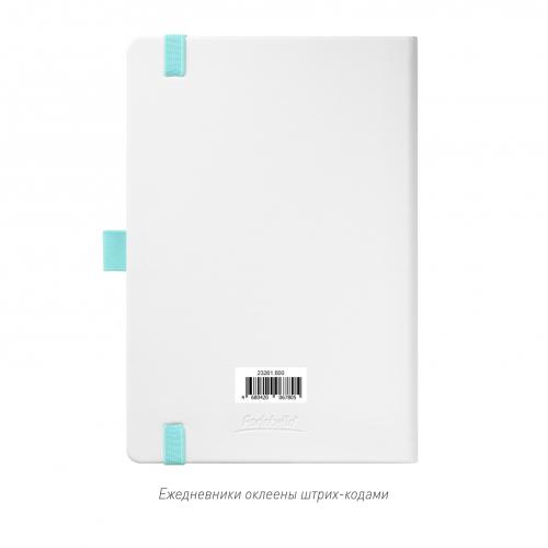 Недатированный ежедневник выполнен в жесткой обложке из искусственной кожи со скругленными уголками. Переплетный материал гладкий, с легкой естественной паутинкой морщин, имеет полуглянцевый блеск. Цвет – чистый белый. Бирюзовые матовые форзац и нахзац, а также бирюзовый срез блока создают оригинальный динамичный цветовой ансамбль и подчеркивают белизну обложки. Страницы светло-кремового цвета, из гладкого офсета, слегка шелковистые, со скругленными уголками. Добавляют изделию мягкую комфортную теплоту. Двойное атласное ляссе составлено из бирюзовой и белой лент. Каждая шириной 6 мм, имеет легкий блеск. Вертикальная фиксирующая резинка прочная, надежная и удобная, в тон срезу. Есть петелька для ручки в тон резинки. Карман на заднем форзаце.