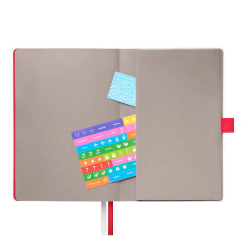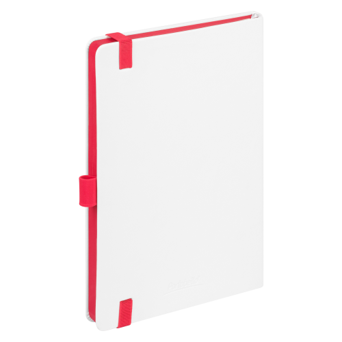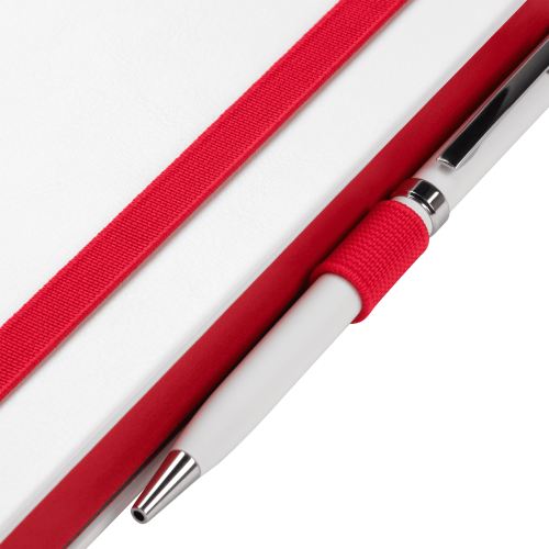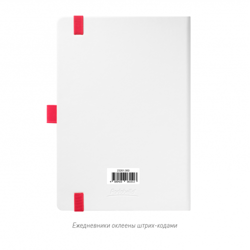 Недатированный ежедневник выполнен в жесткой обложке из искусственной кожи со скругленными уголками. Переплетный материал гладкий, с легкой естественной паутинкой морщин, имеет полуглянцевый блеск. Цвет – чистый белый. Серые матовые форзац и нахзац, а также красный срез блока создают оригинальный динамичный цветовой ансамбль и подчеркивают белизну обложки. Страницы светло-кремового цвета, из гладкого офсета, слегка шелковистые, со скругленными уголками. Добавляют изделию мягкую комфортную теплоту. Двойное атласное ляссе составлено из красной и белой лент. Каждая шириной 6 мм, имеет легкий блеск. Вертикальная фиксирующая резинка прочная, надежная и удобная, в тон срезу. Есть петелька для ручки в тон резинки. Карман на заднем форзаце.