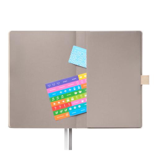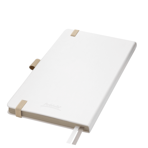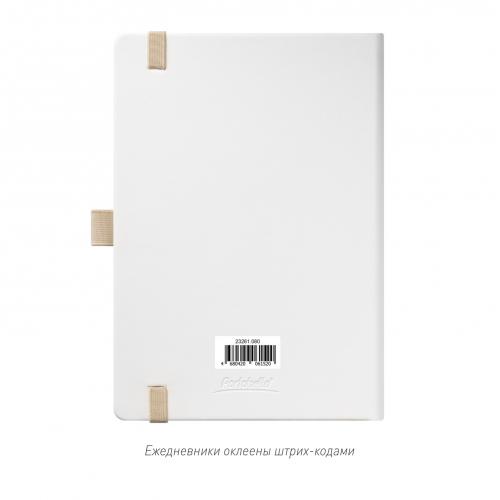 Недатированный ежедневник выполнен в жесткой обложке из искусственной кожи со скругленными уголками. Переплетный материал гладкий, с легкой естественной паутинкой морщин, имеет полуглянцевый блеск. Цвет – чистый белый. Серые матовые форзац и нахзац, а также серо-бежевый срез блока создают оригинальный динамичный цветовой ансамбль и подчеркивают белизну обложки. Страницы светло-кремового цвета, из гладкого офсета, слегка шелковистые, со скругленными уголками. Добавляют изделию мягкую комфортную теплоту. Двойное атласное ляссе составлено из серой и белой лент. Каждая шириной 6 мм, имеет легкий блеск. Вертикальная фиксирующая резинка прочная, надежная и удобная, в тон срезу. Есть петелька для ручки в тон резинки. Карман на заднем форзаце.