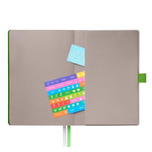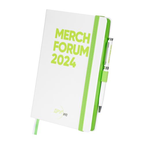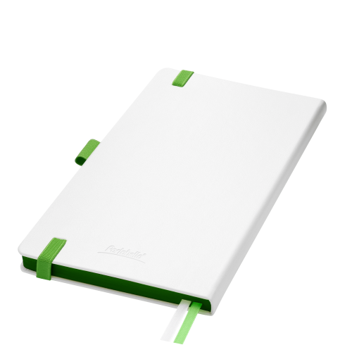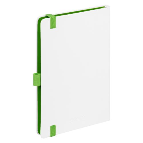 Недатированный ежедневник выполнен в жесткой обложке из искусственной кожи со скругленными уголками. Переплетный материал гладкий, с легкой естественной паутинкой морщин, имеет полуглянцевый блеск. Цвет – чистый белый. Серые матовые форзац и нахзац, а также зеленый срез блока создают оригинальный динамичный цветовой ансамбль и подчеркивают белизну обложки. Страницы светло-кремового цвета, из гладкого офсета, слегка шелковистые, со скругленными уголками. Добавляют изделию мягкую комфортную теплоту. Двойное атласное ляссе составлено из зеленой и белой лент. Каждая шириной 6 мм, имеет легкий блеск. Вертикальная фиксирующая резинка прочная, надежная и удобная, в тон срезу. Есть петелька для ручки в тон резинки. Карман на заднем форзаце.