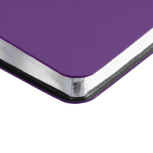 Ежедневник с гибкой обложкой и металлическим корешком, выполнен из материала Soft Touch, фиолетовый UU, дополнен серебристым обрезом блока и ляссе.