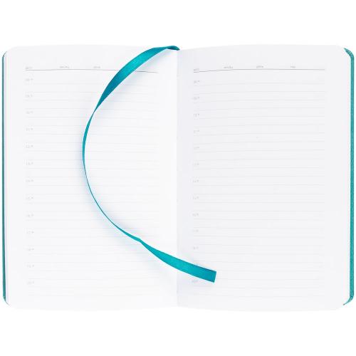 Ежедневник с твердой обложкой, выполнен из материала Latte, цвет морской волны II, дополнен ляссе в цвет обложки.