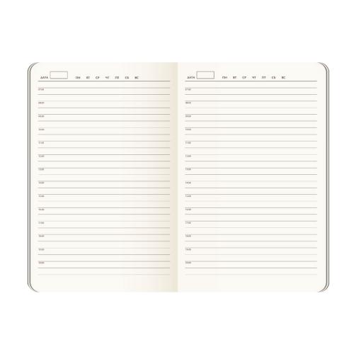 Birmingham – строгость, внушающая доверие. Поверхность ежедневника отсвечивает мягким глянцем и обладает едва заметным неоднородным тиснением, которое качественно имитирует натуральную кожу. Глубокий и чарующий черный цвет жесткой обложки обрисовывается черной фиксирующей резинкой и атласным ляссе. С ними контрастирует светло-кремовый цвет матового форзаца и нахзаца, страниц из гладкого шелковистого офсета и гладкого матового среза.