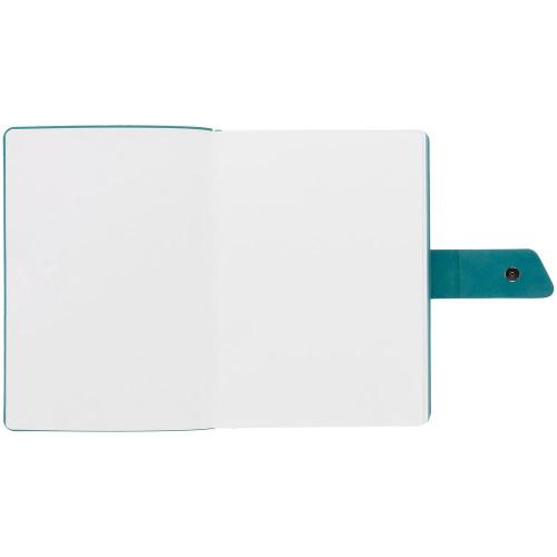 Ежедневник с гибкой обложкой, выполнен из материала La Fite, черный АА и Nubuck, цвет морской волны II, дополнен бирюзовым ляссе и хлястиком на кнопке.