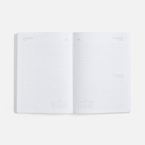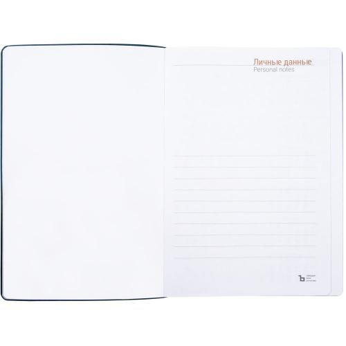 Гибкая обложка ежедневника выполнена из материала Latte, синий НН. Внутри корешка — специальное место для крепления ручки размером до 15х0,9 см.