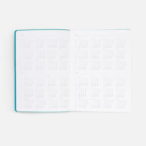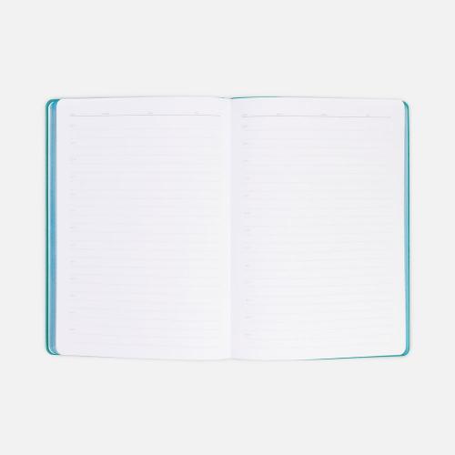 Гибкая обложка выполнена из материала Soft Touch, цвет морской волны II и Latte, цвет морской волны II (внутренняя часть обложки). Внутри корешка — специальное место для крепления ручки размером до 15х1 см.