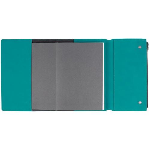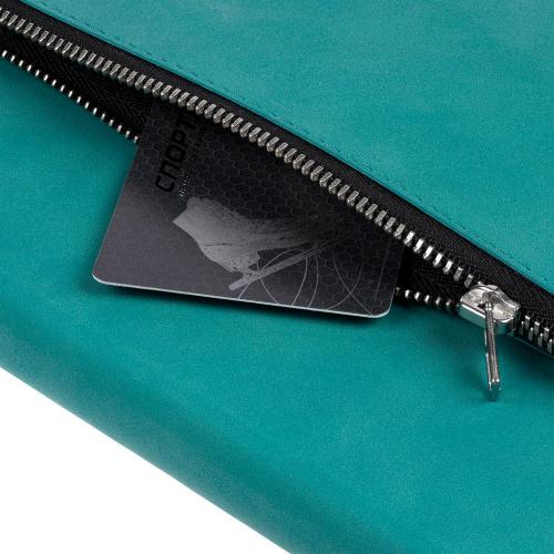 Ежедневник в гибкой суперобложке c карманом на молнии, выполнен из материала Nubuck, цвет морской волны II. Дополнен капталом и металлической шильдой на ляссе серого цвета.