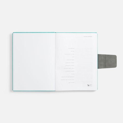 Ежедневник с твердой обложкой, выполнен из материала Nubuck Touch, цвет морской волны II, дополнен капталом, ляссе и обрезом серого цвета. Застежка — хлястик на магните из материала Nubuck Touch, серый СС.