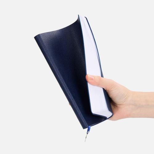 Ежедневник с гибкой обложкой, выполнен из материал La Fite, темно-синий ХХ, дополнен ляссе в цвет обложки с металлическим шильдом.