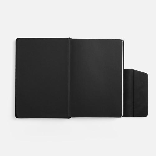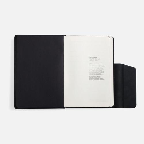 Ежедневник с твердой обложкой и фигурным магнитным клапаном, дополнен капталом и двойным ляссе.