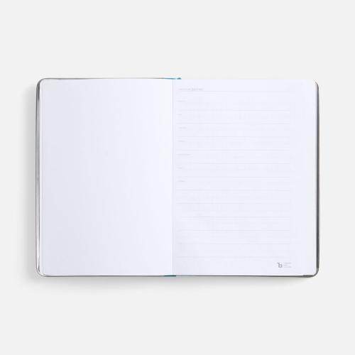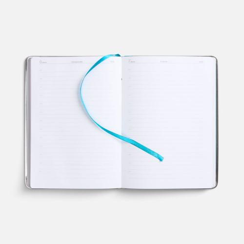 Ежедневник с твердой обложкой и серебристым обрезом блока. Выполнен из материала Nubuck, цвет мроской волны, дополнен цветным ляссе и металлическими рамками с двух сторон обложки.