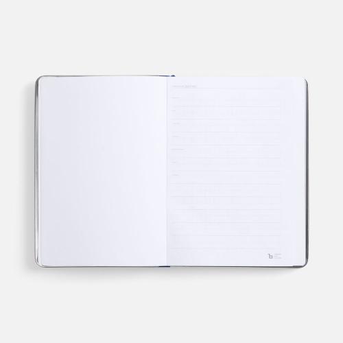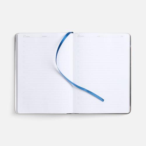 Ежедневник с твердой обложкой и серебристым обрезом блока. Выполнен из материала Nubuck, темно-синий ХХ, дополнен синим ляссе и металлическими рамками с двух сторон обложки.