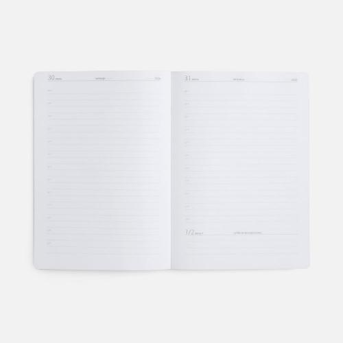 Ежедневник с полутвердой обложкой выполнен из материала Nice Touch, черный АА, и дополнен резинкой шириной 1 см с металлическим шильдом и ляссе черного цвета.
