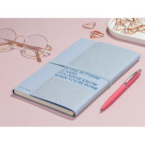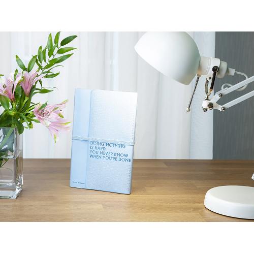 Так трудно ничего не делать, ведь совершенно непонятно, когда ты закончишь! Лаконичный слоган мотивирует к активным действиям. Планируй и завершай! Вот что кроется в элегантной надписи, выполненной золотым тиснением! А Flex обложка напоминает Будь гибким! Великолепный недатированный ежедневник Bilbao черно-синего цвета с тиснением фольгой. Бежевая бумага 65 г/м, широкая горизонтальная фиксирующая резинка. Гибкая обложка с покрытием Soft-touch. Особенность этого ежедневника - часть обложки внахлест может использоваться как закладка. Ежедневник упакован в картонный полукороб и термопленку.