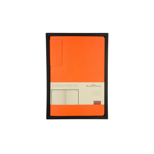Лаконичная модель в ярком исполнении: гибкая обложка оранжевого цвета с контрастной или в цвет обложки нашивкой. Выполнен из качественной и прочной искусственной кожи, крепление внутреннего блока - книжный переплет, закладка- ляссе. Углы обложки скруглены.