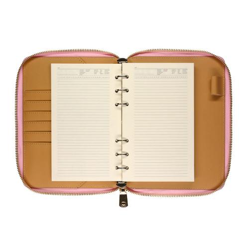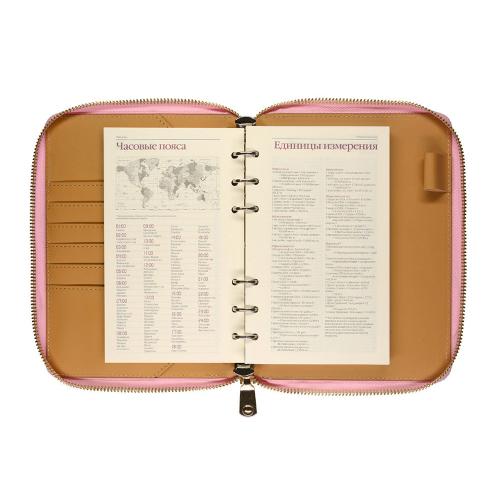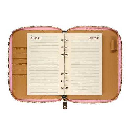 Деловая нежность! Вот как можно охарактеризовать этот очаровательный розово-зефирный ежедневник. Большое отделение на молнии вмещает в себя и сменный блок для записей на кольцевом механизме, и отделения для визиток и ручки. В этом бизнес-аксессуаре поместятся и дополнительные документы и смартфон.