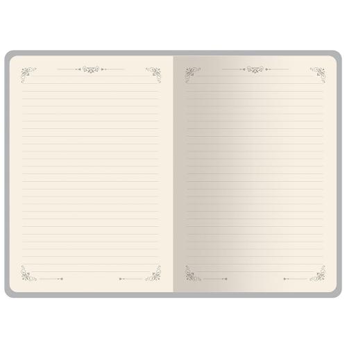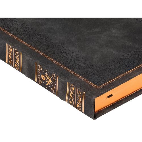 Недатированный ежедневник Royal формата А5 с твердой обложкой из искусственной кожи с имитацией нубука украшен художественным бронзовым и блинтовым тиснением. Внутри 256 страниц, выполненных из качественной бежевой бумаги в линейку плотностью 100 г/м². Два шелковых ляссе в цвет обреза блока и обложки облегчают навигацию по записям. Французский корешок дополнительно декорирован изящным бронзовым тиснением в виде виньеток. Скругленные углы обложки и блока подчеркивают стильный дизайн изделия, а блеск бронзового обреза дарит ежедневнику благородный и роскошный внешний вид.