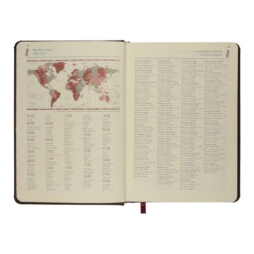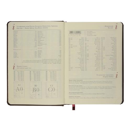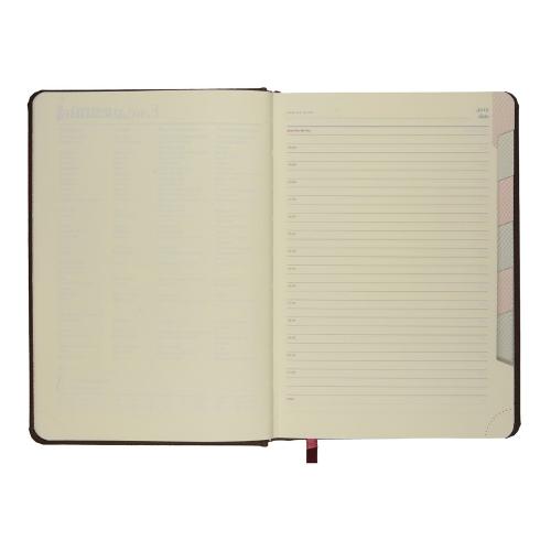Незаменимый помощник в деле эффективного планирования благодаря высокому качеству производства и тщательно продуманных элементов: мягкая бархатистая обложка со скругленными уголками и строчкой по периметру в цвет, вырубные индексы с цветной маркировкой, разбивающей блок на месяцы, закладка-ляссе, перфорированные углы блока, линовка листов с указанием времени суток.