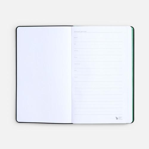 Ежедневник с гибкой обложкой выполнен из материала Nice Touch, черный АА и Soft Touch Ultra, зеленый FF, дополнен ляссе зеленого цвета.