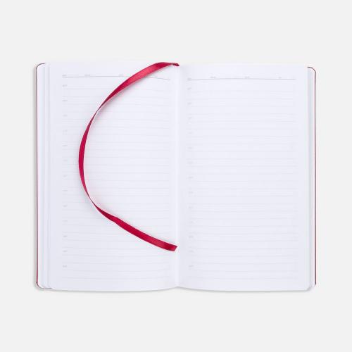 Ежедневник с твердой обложкой, выполнен из материала LaFite, красный РР, дополнен резинкой с металлическим прямоугольным шильдом и ляссе в цвет обложки.