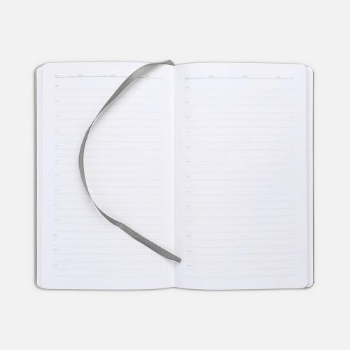 Ежедневник с твердой обложкой, выполнен из материала LaFite, серый СС, дополнен резинкой с металлическим прямоугольным шильдом и ляссе в цвет обложки.