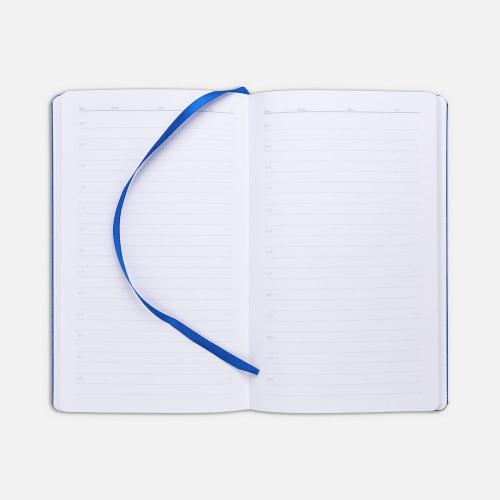 Ежедневник с твердой обложкой, выполнен из материала LaFite, темно-синий ХХ,дополнен резинкой с металлическим круглым шильдом и ляссе в цвет обложки.