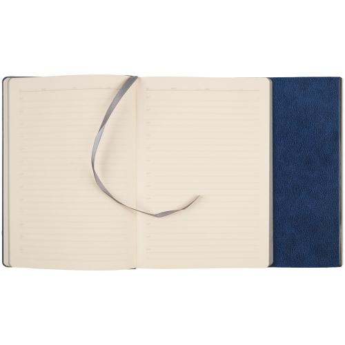 Ежедневник с гибкой обложкой, клапаном на магните и металлической отделкой клапана. Выполнен из материала Petrus, синий НН, дополнен серым ляссе.