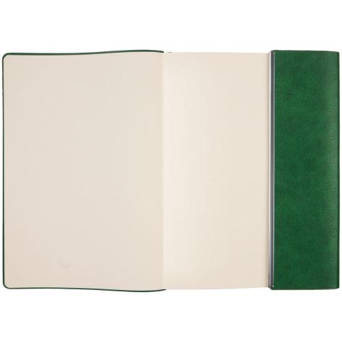 Ежедневник с гибкой обложкой, клапаном на магните и металлической отделкой клапана. Выполнен из материала Petrus, зеленый FF, дополнен серым ляссе.